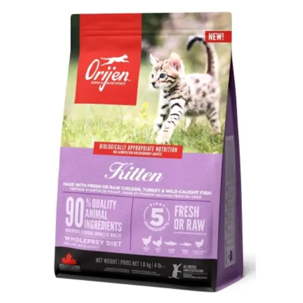 Análisis de adecuación: Orijen Kitten es un pienso de Gama Élite, diseñado específicamente para gatitos desde el destete hasta los 12 meses. Es excepcional para cubrir las demandas de energía y desarrollo cognitivo (DHA). **No es apto** para gatos adultos sedentarios o con tendencia a cristales (por su alta densidad mineral), ni para gatos senior con Insuficiencia Renal, debido a su carga de fósforo y cenizas (9%). Es imperativo acompañar este alimento con una ración diaria de comida húmeda para proteger el sistema renal en formación.